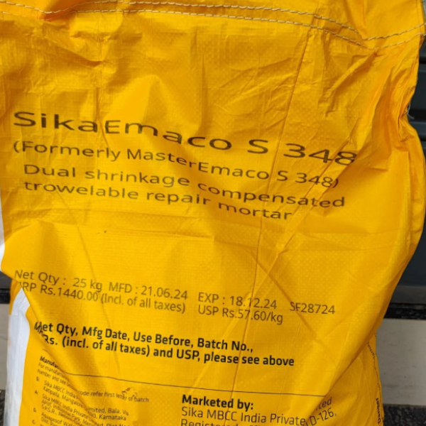 SikaEmaco S 348 Crack Repair Mortar MasterEmaco S 348 trowelable mortar is a dual shrinkage compensated, thixotropic high strength formulation for structural concrete repairs. MasterEmaco S 348 is suitable for placing in thicknesses of 12mm to 50 mm both vertically and overhead. MasterEmaco S 348 provides a durable, strong structural repair fully compatible with host concrete.